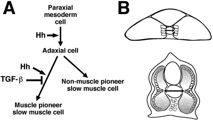 We have examined whether the development of embryonic muscle fiber type is regulated by competing influences between Hedgehog and TGF-beta signals, as previously shown for development of neuronal cell identity in the neural tube. We found that ectopic expression of Hedgehogs or inhibition of protein kinase A in zebrafish embryos induces slow muscle precursors throughout the somite but muscle pioneer cells only in the middle of the somite. Ectopic expression in the notochord of Dorsalin-1, a member of the TGF-beta superfamily, inhibits the formation of muscle pioneer cells, demonstrating that TGF-beta signals can antagonize the induction of muscle pioneer cells by Hedgehog. We propose that a Hedgehog signal first induces the formation of slow muscle precursor cells, and subsequent Hedgehog and TGF-beta signals exert competing positive and negative influences on the development of muscle pioneer cells.
