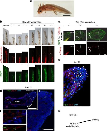 Figure 1. SMFC tracking in larval newt limb regeneration.(a) Larva (3 months old). It has four limbs, as well as the gills and tail fin. Scale bar, 4 mm. (b) Monitoring of SMFCs (mCherry+) during limb regeneration (n=6). mCherry was not detected in the regenerating part of the limb until ∼30 days when the amputated limb had almost been recovered (see Supplementary Movie 1). Arrowheads: flexor muscle for digits (see Fig. 2). Scale bar, 1 mm. (c) Sections of regenerating limbs (n=3 for each stage). SMFC-derived mCherry+ cells were not observed in the blastema. Lines: amputation site. m: muscle. Scale bar, 100 μm. (d–f) Pax7 immunolabelling of regenerating limbs on day 12 (n=3) and (g) day 15 (n=3) after amputation. (d) On day 12, a few Pax7+ nuclei (arrowheads) were detected in blastema cells and in satellite cells along the muscle fibres. Col IV, collagen type IV immunoreactivity. DAPI (4,6-diamidino-2-phenylindole), nuclei. Scale bar, 300 μm. The Pax7+ nuclei pointed by arrowheads were enlarged in e and f, respectively. Scale bars, 100 μm. (g) On day 15 when the regenerating part of the limb grew more distally, the number of Pax7+ nuclei (arrowheads) in the blastema was dramatically increased. Scale bar, 100 μm. (h) Summary. In larval newts, MPCs, potentially satellite cells, were recruited for new muscle during limb regeneration, whereas SMFCs were not. |
