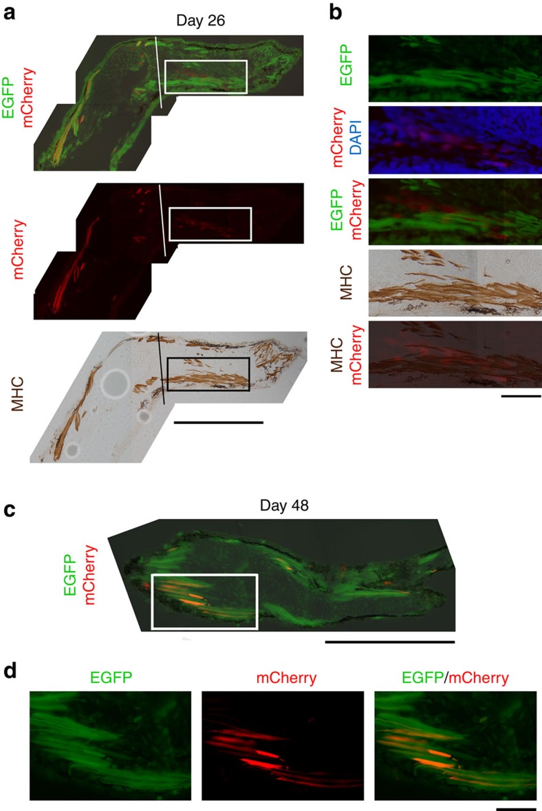 Figure 2. Appearance of mCherry in a late stage of larval limb regeneration.(a) A section of the limb on day 26 after amputation (n=3). mCherry was detected in mononucleated cells, which had occupied the same area as the differentiating flexor muscle for digits (rectangle). Lines: amputation site. MHC, myosin heavy chain immunoreactivity. Scale bar, 500 μm. (b) Enlargement of the area enclosed by the rectangle in a. At this stage, mCherry did not overlap with the flexor muscle. Scale bar, 100 μm. (c) A section of the forearm on day 48 after amputation (n=3). Scale bar, 500 μm. (d) Enlargement of the area enclosed by a rectangle in c. The flexor muscle for digits at this stage exhibited mCherry. Scale bar, 100 μm. |