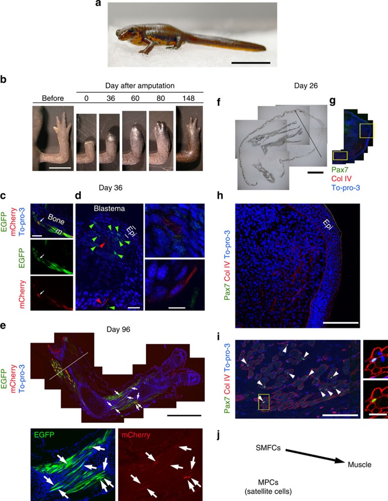 Figure 3. SMFC tracking in metamorphosed newt limb regeneration.(a) Juvenile (16 months old). Scale bar, 15 mm. (b) Limb regeneration. Scale bar, 5 mm. (c–e) Tracking of SMFCs (mCherry+) (n=2). This animal was a mosaic expressing EGFP in muscle only. mCherry+ fibres in the forearm were ∼25% of total EGFP+ fibres. (c) On day 36 after amputation, fragments of muscle fibres (arrows) were observed in distal regions adjacent to the blastema. Scale bar, 100 μm. (d) mCherry+ mononucleated cells (red arrowheads; enlarged in right-hand panels) and EGFP+ cells (green arrowheads) were observed in the blastema. Epi, epidermis. To-pro-3: nuclei. Scale bars, 50 μm (left), 10 μm (right-hand panels). (e) In the same limb, at day 96 after the second amputation in the upper arm (line), mCherry (arrows) and EGFP were observed only in muscle fibres. Scale bars, 1 mm (upper panel), 500 μm (lower panels). (f–i) Pax7 immunolabelling of a regenerating limb on day 26 after amputation (n=4). Pax7 immunoreactivity was not detected in the blastema. (f) Translucent image. Line: amputation site. (g) Merged fluorescence image. Col IV, collagen type IV immunoreactivity. To-pro-3: nuclei. Scale bar, 1 mm. (h) Enlargement of a region in the blastema and (i) a region proximal to the amputation site, enclosed by boxes in g. Scale bars, 250 μm. Arrowheads in (i) Pax7+ nuclei. An example satellite cell (box) is enlarged in the right-hand panels (upper: Col VI/To-pro-3; lower: Col IV/Pax7). Scale bar, 50 μm. (j) Summary. In metamorphosed newts, SMFCs were recruited for new muscle during limb regeneration, whereas MPCs such as satellite cells were not. |