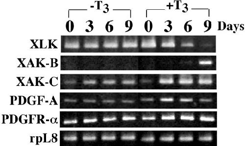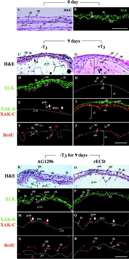 The anuran remodels the larval skin into the adult counterpart during metamorphosis. The construction of the precursor of adult epidermis (preadult epidermis) in Xenopus laevis larvae was coordinated with the development of the secondary connective tissue (s-ct) underneath the basement membrane, suggesting that the epithelial-mesenchymal interaction plays a critical role in the metamorphic conversion of the larval skin. mRNAs of platelet-derived growth factor A (PDGF-A) and PDGF receptor (PDGFR) -alpha were markedly up-regulated in the skin during spontaneous and thyroid hormone (TH) -induced metamorphosis. In situ hybridization experiments identified preadult epidermal basal cells and fibroblasts in developing subepidermal connective tissues at the late prometamorphic stage as PDGF-A and PDGFR-alpha mRNA-expressing cells, respectively. We developed an in vitro model of larval skin that was remodeled to the adult skin under the influence of TH. The presence of either of AG1296, a specific inhibitor of PDGFR tyrosine kinase autophosphorylation, or an excess of recombinant proteins of the soluble extracellular domain of PDGFR-alpha inhibited the following TH-induced processes, the proliferation of adult basal cells, the terminal differentiation of adult basal cells, and the activation of subepidermal fibroblasts. However, the inhibitors did not inhibit the TH-induced proliferation of preadult basal cells. We concluded that PDGF/PDGFR signaling is one of the prime cues in the epithelial-mesenchymal interaction required for the metamorphic skin remodeling.