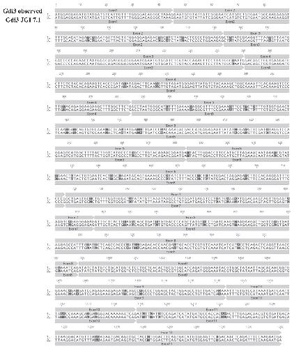 Fig. 2. Alignment of the Xenopus tropicalis GDI3 protein sequence against the JGI 7.1 GDI3 predicted protein sequence. The upper rowcorresponds to the observed GDI3 DNA sequence and