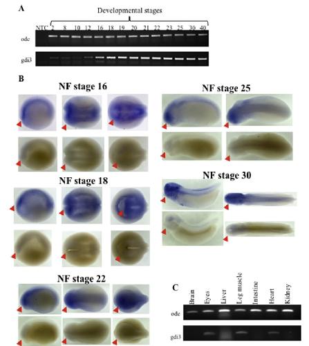 Fig. 4. GDI3 expression in X. tropicalis. (A) Xenopus tropicalis embryos were harvested at the Nieuwkoop-Faber stages shown and RNA extracted prior to RT-PCR analysis by odc (as an