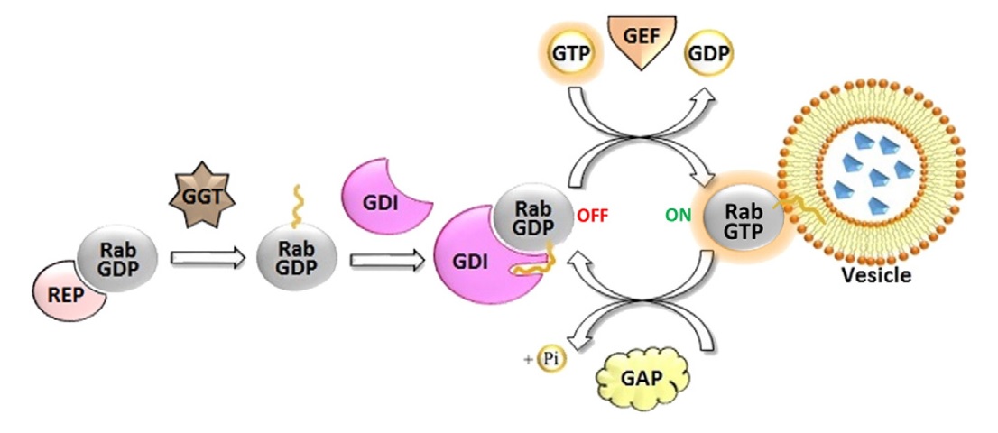 (GDI) and is ready to regulate vesicle shuttling. Subsequently Rab-GDP is activated by exchange to Rab-GTP, a process assisted by guanine exchange factor (GEF). Once activated Rab-