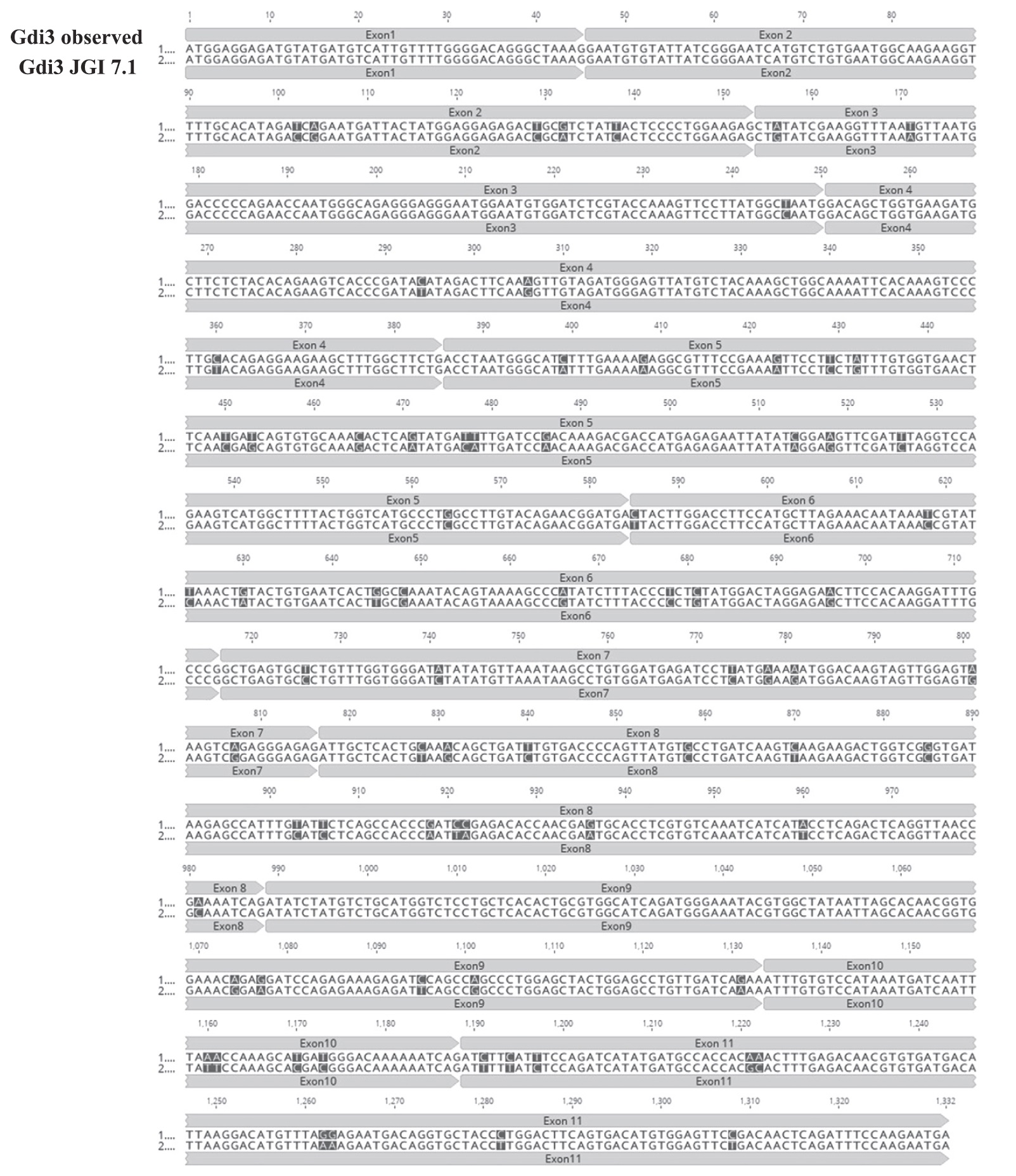 the lower row the GDI3 predicted protein sequence obtained from Xenbase genome assembly JGI 7.1 of Xenopus tropicalis. Bases highlighted indicate SNPs between the two sequences