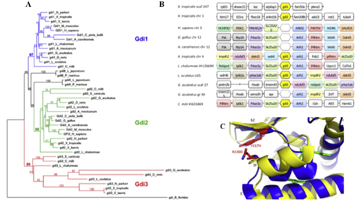 Fig. 3. Phylogenetic and syntenic analysis of the GDI genes. (A) Phylogenetic tree of chordate GDI proteins. The tree shows the phylogenetic relationship of GDI protein sequences from