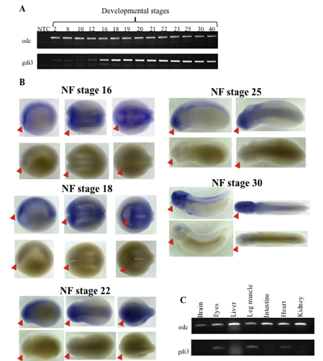 internal reference) and GDI3 specific primers. GDI3 expression is observed throughout all the sampled developmental stages. (B) In situ hybridisation analysis of Xenopus tropicalis
