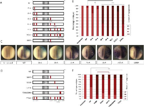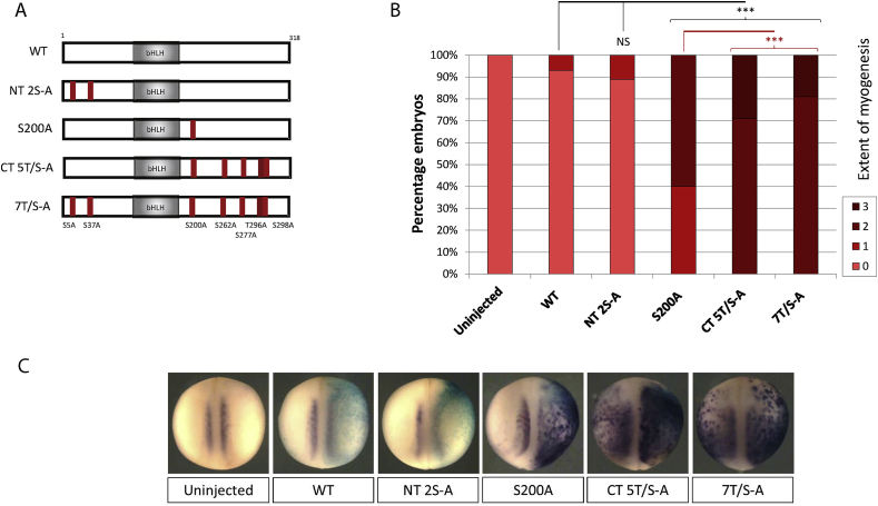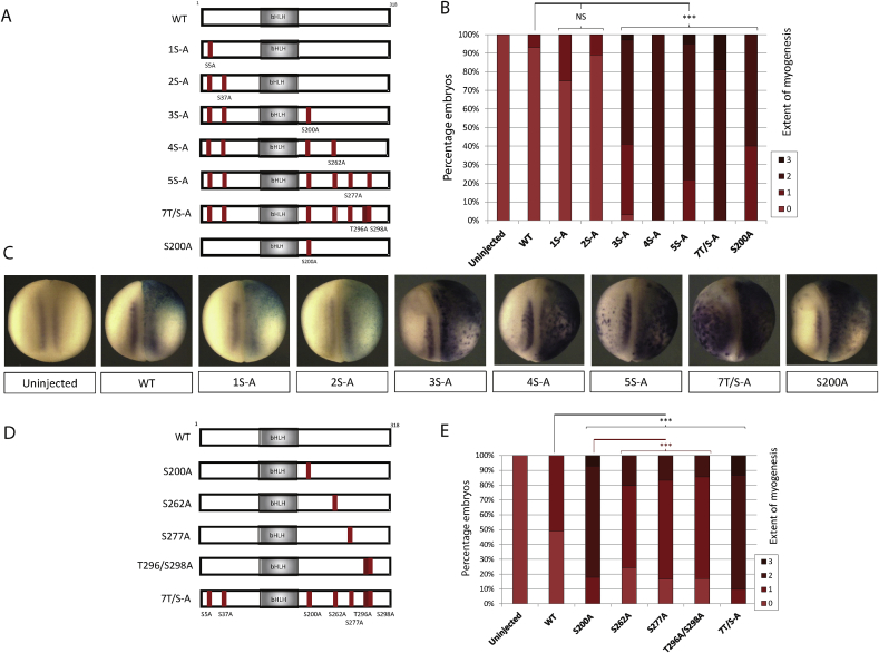 Fig. 3. Maximal myogenic activity is achieved by mutation of multiple C terminal sites. (A) Schematic representation of phospho-mutant constructs. (B) Two-cell stage embryos were unilaterally injected with 100 pg mRNA of the respective MyoD construct and assayed at stage 18 as before [n = 32â41] with representative images shown in (C). NS = Not significant; * = (p < 0.05); ** = (p < 0.025); *** = (p < 0.0125).