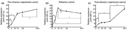 Real-time RTâPCR of xNP1-transcripts in tail tissues of the âpre-refractory regenerationâ, ârefractoryâ, and âpost-refractory regenerationâ period tadpoles within 48 h after amputation. Real time RTâPCR was performed using total RNA extracted from the tail stumps (2-mm wide tail tissues) of the (a) âpre-refractory regenerationâ, (b) ârefractoryâ, and (c) âpost-refractory regenerationâ period tadpoles at 0, 5, 10, 15, 24 and 48 h after amputation. The numbers of individuals used for experiments were: 15â16 à 4 lots, 20 à 4 lots, and 5 à 4 lots for âpre-refractory regenerationâ, ârefractoryâ, and âpost-refractory regenerationâ periods, respectively. The relative amounts of xNP1 transcripts determined by real-time RTâPCR were obtained by taking the value at 0 h after amputation as 1 for each (a) âpre-refractory regenerationâ period, (b) ârefractoryâ period and (c) âpost-refractory regenerationâ period after normalization relative to elongation factor 1α (EF1α) transcript levels. The bars indicate standard errors. Single and double asterisks indicate statistically significant differences: P < 0.05 and P < 0.01 using the TukeyâKramer method. |
