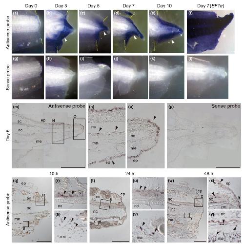 In situ hybridization of xNP1-transcripts in regenerating tails of the âpost-refractory regenerationâ period tadpoles within 10 days after amputation. Whole mount in situ hybridization was performed using the regenerating tails of âpost-refractory regenerationâ period tadpoles on (a and g) day 0, (b and h) days 3, (c and i) days 5, (d, j, f and l) days 7, and (e and k) days 10 after amputation, with (aâe) antisense or (gâk) sense DIG-labeled xNP1 probe. Arrowheads in (bâe) indicate signals. Yellow dash lines in (bâe) indicate amputation plane. As positive and negative controls for hybridization, the regenerating tadpole tails on day 7 after amputation were hybridized with (f) antisense or (l) sense DIG-labeled EF1α probe. xNP1 expression in the regenerating tail on day 5 after amputation was also examined by section in situ hybridization using (mâo) antisense or (p) sense DIG-labeled xNP1 probes. (n and o) are magnified views of boxed areas in (m). We also performed in situ hybridization on 10, 24 and 48 h after amputation (qây). (r and s), (u and v), (x and y) are magnified views of boxed areas in (q, t and w), respectively. The orientation of the specimen is; left, anterior; right, posterior; top, dorsal; and bottom, ventral. The bars in (m, p, q, t and w) indicate 0.5 mm. Arrowheads in (n, o, r, s, u, v, x and y) indicate signals. ep, epidermis; me, mesenchyme; nc, notochord; sc, spinal cord. |