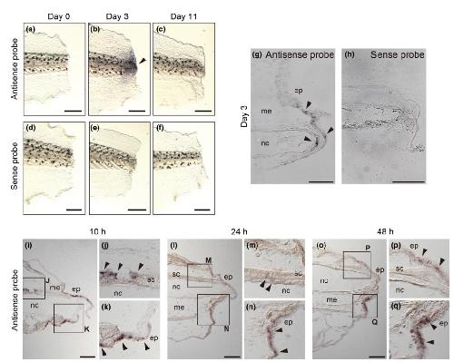 In situ hybridization of xNP1 transcripts in wound tail stumps of the ârefractoryâ period tadpoles after amputation. Whole mount in situ hybridization was performed using amputated tail stumps of the ârefractoryâ period tadpoles on (a and d) day 0, (b and e) days 3, and (c and f) days 11 after amputation, with (aâc) antisense or (dâf) sense DIG-labeled xNP1 probe. xNP1 expression in the amputated tail stumps on 3 days after amputation was also examined by section in situ hybridization using (h) antisense or (i) sense DIG-labeled xNP1 probes. We also performed in situ hybridization on 10, 24 and 48 h after amputation (iâq). (j and k), (m and n), (p and q) are magnified views of boxed areas in (i, l and o), respectively. The bars indicate (aâf) 1 mm and (g, h, i, l and o) 0.1 mm, respectively. The orientation of the specimen in each panel was the same as in Figure 3. Arrowheads in each panel indicate signals. ep, epidermis; me, mesenchyme; nc, notochord; sc, spinal cord. |