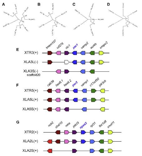 Identification and syntenic analysis of clock genes. Phylogenetic analysis of Per (A), Cry (B), Clock (C), and Bmal (D). In circadian rhythms, there are two clock, two bmal, two cry, and three per genes in X. tropicalis, as in mammals. Using clock genes of X. tropicalis, we identified 15 homeolog candidates of X. laevis. Phylogenetic analysis indicated six homeolog pairs (clock.L/clock.S, bma1.L/bmal1.S, bmal2.L/bmal2.S, per3.L/per3.S, cry1.L/cry1.S, and cry2.L/cry2.S) and three singletons (per1.L, per2.L, and npas2.L). Synteny analyses of per1(E), per2(F), and npas2(G). Synteny analysis of X. laevis and X. tropicalis indicated that per1.S, per2.S, and npas2.S were lost from XLA3S, XLA5S, and XLA2S, respectively. |