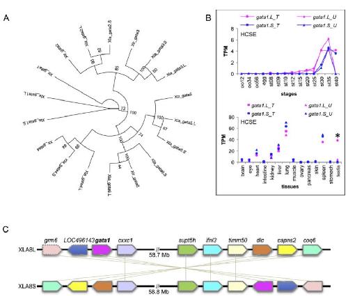 Identification, transcriptomic analysis, and syntenic analysis of GATA family genes. (A) Phylogenetic analysis of GATA family genes. GATA family genes are separated into two groups, GATA1-3 and GATA4-6. (B) Expression of gata1.L and gata1.S in oocytes / developmental stages (above) and adult tissues (below). Although gata1 is categorized as HCSE in both data sets, 55.3/82.7-fold expression differences between homeologs are seen in adult testis of Clutches T/U (marked with an asterisk). (C) Comparison of synteny around gata1.L and gata1.S genes. These genes are located on XLA8L and 8S, respectively. XLA8S has undergone multiple, large-scale chromosome rearrangements ( Session et al., 2016) and gata1.S is positioned at the rim of the inverted region. grm6.L and LOC496143.L are pseudogenes. |