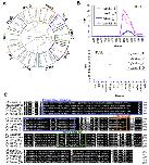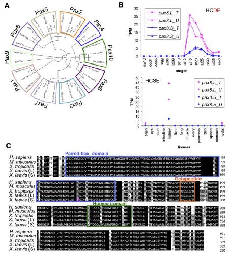 Identification, transcriptomic analysis, and sequence diversification of Pax family genes. (A) Phylogenetic tree analysis of X. tropicalis and X. laevis Pax family proteins. (B) RNA-seq analysis of differential expression of pax8 homeologs during development and in adult tissues. Transcriptomic data are shown in graphs similar to those in Fig. 1. (C) Comparison of amino acid sequences of mammalian and Xenopus Pax5 proteins. Magenta shading indicates substitution of a basic amino acid (R) with a non-polar amino acid (G) in the paired-box domain of Pax5.S. GenBank accession numbers of human and mouse Pax5 proteins used for this alignment are NP057953 and NP032808, respectively. |