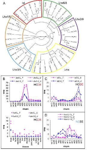 Identification and transcriptomic analysis of Lhx family genes. (A) Phylogenetic tree of Lhx family genes of Xenopus. Xtr, X. tropicalis, Xla, X. laevis. Bootstrap support values for nodes are indicated (n=100). Subfamilies were supported at 100 values and orthologs were supported at 93â100 values, except for lhx2 (83) and lhx9 (65). Transcriptomic data of lhx5 (B), isl2 (C), and lmx1b.1 (D) are shown in graphs similar to those in Fig. 1. See text for detailed explanations of variable expression profiles. |