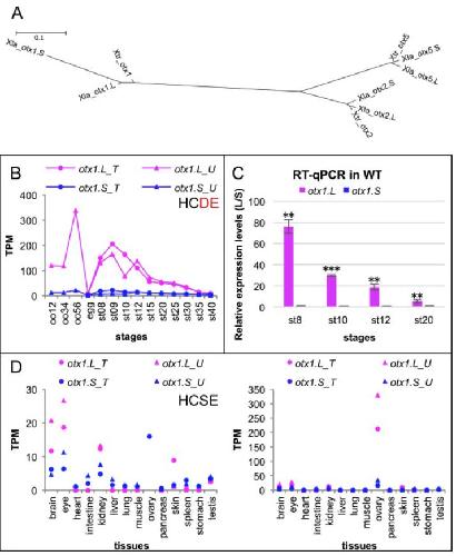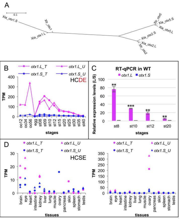 Diversification of otx1 homeologs in sequence and expression profiles. (A) Phylogenetic tree of the Otx subfamily with distances. A scale bar of branch length indicates substitutions per site. The branch length of X. laevis otx1.S is much longer than that of X. laevis otx1.L and X. tropicalis otx1, suggesting that otx1.S evolved fast and diverged from other otx1 genes. (B) Transcriptomic data of otx1 in developmental stages. (C) RT-qPCR using outbred animals. Bars represent means±s.d. of expression levels of otx1.L relative to otx1.S at indicated stages. **, P<0.01, ***, P<0.001 (t-test, two-tailed). (D) Transcriptomic data of otx1 in adult tissues. Two panels represent the same data at different scales. Data are shown in graphs similar to those in Fig. 1. See text for detailed explanations of variable expression profiles.