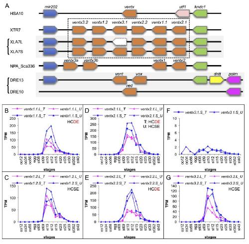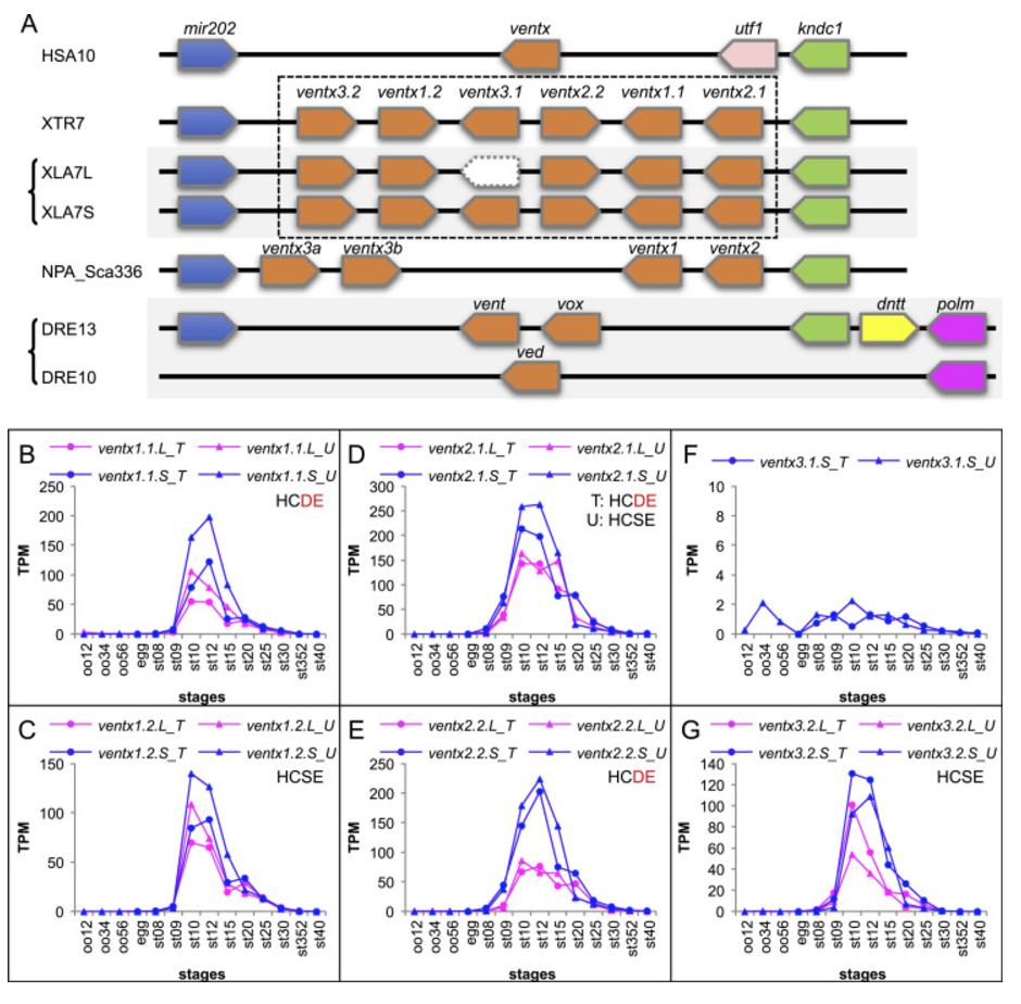 Genomic structure and expression profiles of Ventx gene clusters. (A) Structures of ventx gene clusters. Humans only have one ventx gene in HSA10. However, in Xenopus, ventx genes are tandemly duplicated to form a cluster. X. tropicalis has 6 genes, whereas X. laevis has 11 genes, in which ventx3.1.S is a singleton due to pseudogenization of ventx3.1.L. Nanorana has single copies of ventx1 and vextx2 and two copies of ventx3 in scaffold_336. Zebrafish have vent and vox on DRE13 and ved on DRE10. HSA, Homo sapiens; NPA, Nanorana parkeri; DRE, Danio rerio. (B-G) Transcriptomic analyses for ventx cluster genes during oogenesis and embryogenesis. Data are shown in graphs similar to those in Fig. 1. See text for detailed explanations of variable expression profiles. |