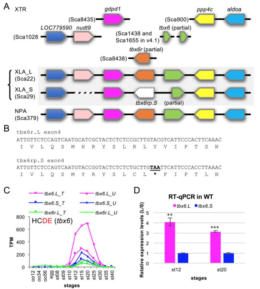 Genomic structure and expression profiles of tbx6 and tbx6r. (A) Schematic representation of genomic organization around the tbx6 and tbx6r genes. Syntenic genes of tbx6 and tbx6r are fragmented in scaffolds in the X. tropicalis genome. Unfortunately, tbx6 was not found in v9 of the X. tropicalis genome, although it was found in v4.1. Transposon sequences in scaffolds suggested that scaffold_22 is from the L chromosome and scaffold_29 is from the S chromosome. The sequence of tbx6.S is partial, possibly because 5Ⲡexons were covered with gaps (Ns) in the genome. tbx6rp.S means that tbx6r.S became a pseudogene. In addition to tbx6r.S, nudt9.S seems to have been deleted from the X. laevis genome. (B) Sequences of exon4 for tbx6r.L and tbx6r.S with translated amino acid sequences. A mutation to insert a stop codon was found in tbx6r.S, as indicated with bold letters and an underline, resulting in a pseudogene. (C) Expression profiles of tbx6 and tbx6r were similar to those previously reported ( Callery et al., 2010), in which tbx6 is analyzed as one gene without distinguishing tbx6.L and tbx6.S and relative expression levels were analyzed with quantitative RT-PCR. Data are shown in graphs similar to those in Fig. 1 with additional data of tbx6r shown in green. See text for detailed explanations of the variable expression profiles. (D) RT-qPCR using outbred animals. Bars represent means±s.d. of expression levels of tbx6.L relative to tbx6.S at indicated stages. **, P<0.01, ***, P<0.001 (t-test, two-tailed).