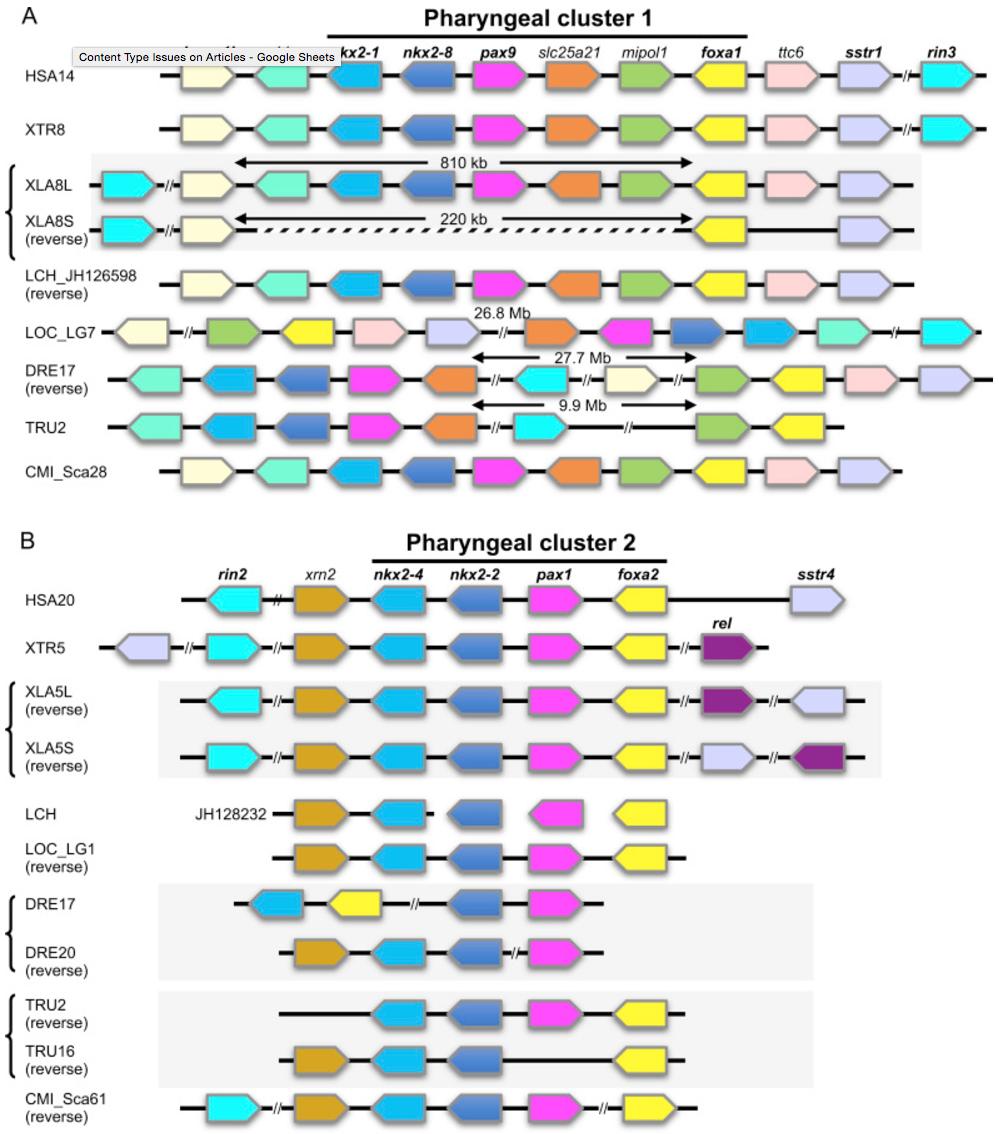 Comparison of pharyngeal gene clusters in vertebrate genomes. (A) Comparison of pharyngeal cluster 1, which includes transcription factors, nkx2-1, nkx2-8, pax9, and foxa1. In the X. laevis genome, genes from mbip.S to mipol1.S are deleted, but foxa1.S is retained in XLA8S. In actinopterygian genomes, genes from mbip to slc25A21 are retained as a cluster, but genes from mipol to sstr1 are located in a distant genomic region. Teleost genomes only possess one cluster, possibly due to deletion of the duplicated cluster after whole genome duplication. (B) Comparisons of pharyngeal cluster 2, which consists of transcription factors, nkx2-4, nkx2-2, pax1, and foxa2. In the X. laevis genome, duplicated clusters are completely conserved in both XLA5L and 5S. In the coelacanth genome, nkx2-2, pax1, and foxa2 are separated into scaffolds, JH130518, JH128098, and JH128726, respectively, one gene per scaffold. In teleost genomes, duplicated clusters are partially conserved after the teleost-specific, whole-genome duplication. Syntenic gene homologs with foxa genes are indicated with bold letters. HSA, Homo sapiens; XTR, Xenopus tropicalis; XLA, Xenopus laevis; LCH, Latimeria chalumnae (coelacanth); LOC, Lepisosteus oculatus (spotted gar); DRE, Danio rerio (zebrafish); TRU, Takifugu rubripes (fugu); CMI, Callorhinchus milii (elephant shark). |