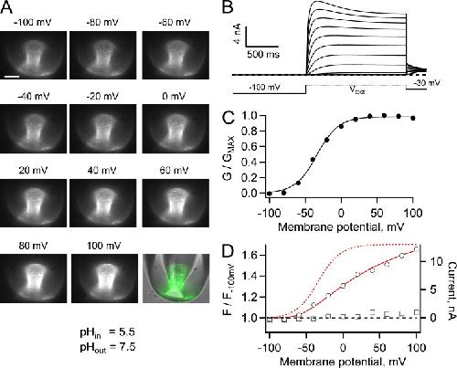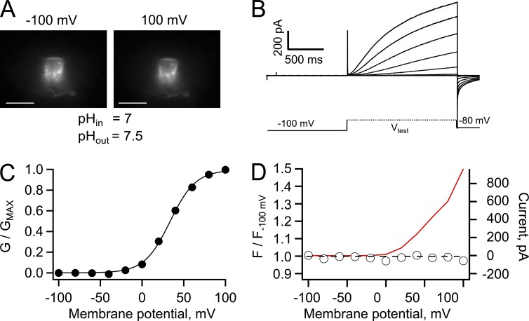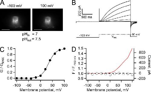 Figure 3. Patch-clamp fluorometry of Venus-Hv1 at pHi 7. (A) Fluorescence images of an inside-out patch held at the indicated membrane potential. Bars, 10 µm. (B) Proton currents from the patch in A elicited by depolarizing voltage-clamp pulses, as indicated by the schematic protocol. (C) Conductance versus voltage curve derived from the currents in B. The continuous line is a fit to Eq. 2 with parameters qa = 1.62 eo and V0.5 = 33.6 mV. (D) Fluorescence measured from the whole patch area at each voltage was normalized to the fluorescence at −100 mV. A ratio equal to one at all voltages indicates the absence of dequenching of the fluorescence of Venus. The red continuous line is the I-V curve from the currents in B. The bath solution contained 10 mM HEPES buffer. |