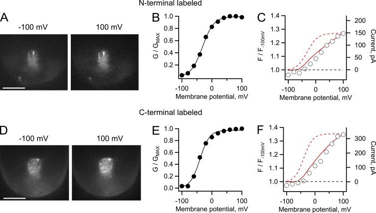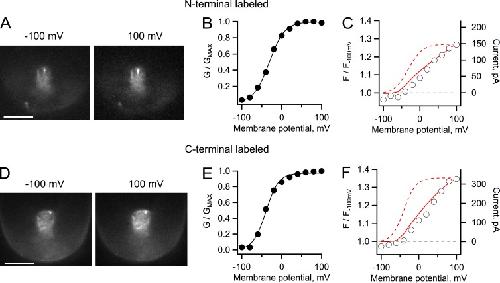 Figure 2. Patch-clamp fluorometry of Venus-Hv1 and Hv1-Venus constructs. (A) Fluorescence images of an inside-out patch from an oocyte expressing Hv1 channels labeled with Venus in the N terminus. The patch was held at the indicated membrane potential. (B) G-V curve from proton currents from the patch in A elicited by depolarizing voltage-clamp pulses. The continuous line is a fit to Eq. 2 with parameters qa = 1.31 eo and V0.5 = −31.2 mV. (C) Fluorescence measured from the whole area of the patch in A at each voltage, plotted as normalized intensity with respect to the fluorescence intensity at −100 mV. (D) Fluorescence images from an inside-out patch from oocytes expressing the Hv1 construct labeled at the C terminus. (A and D) Bars, 10 µm. (E) G-V curve from proton currents from the same patch in D elicited by depolarizing voltage-clamp pulses. The continuous line is a fit to Eq. 2 with parameters qa = 1.56 eo and V0.5 = −39.6 mV. (F) Fluorescence measured from the whole patch area and analyzed as in C. For the analysis in C and F, a ratio greater than one indicates an increase (dequenching) of the fluorescence as the patch is held at increased positive potentials. The red continuous line is the I-V curve from the currents in the corresponding patch, whereas the dashed curve is the fit to the G-V curve. The buffer concentration for these experiments was 10 mM MES, and the pH gradient is as in Fig. 1. |