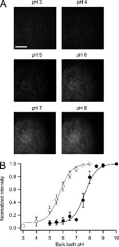 Figure 5. Measurement of the pKa of fluorescent constructs. (A) Representative membrane sheet from oocytes injected with the Venus-Hv1 construct. The membrane was imaged under different pH conditions, indicated at the top of each frame. Fluorescence was measured as the mean of an ROI encompassing a large area of the membrane sheet or from individual clusters of channels with the same results. Bar, 20 µm (same for all images). (B) The fluorescence was normalized to the value at the highest pH for each construct to build the full titration curve. The data were fitted to the titration function (Eq. 3). The pKa for Venus-Hv1 (open circles) is 5.63 and 7.62 for VenusH148G-Hv1 (closed circles). The data are the mean of five experiments for both constructs, and error bars are the standard error of the mean. |