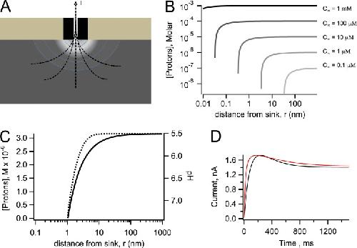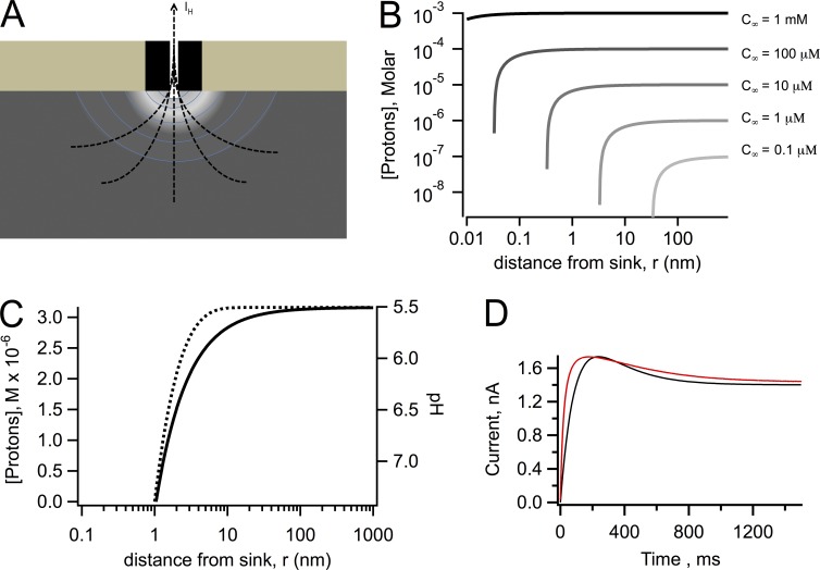 Figure 7. Diffusion model calculations. (A) Schematic representation of the proton depletion zone generated by an outward proton current through an Hv1 channel. (B) Calculations using Eq. 5 of the extent of the depletion of protons as a function of the radial coordinate, r, for different values of the bulk proton concentration, c∞, as indicated; the value of q = 14 fA is the same for all curves as well as DH = 7,000 µm2/s. (C) Calculation of the effect of the presence of buffer. The black curve was calculated with DH = 7,000 µm2/s and Eq. 5. The effect of the presence of buffer is illustrated by the dotted line, which was calculated with Eq. 6. The values of the constants are c∞ = 3.16 µM, [B] = 100 mM, a = 1 nm, kb = 1010 M−1s−1, and DH = 7,000 µm2/s. Data are presented as molar proton concentration (left axis) and corresponding pH (right axis). (D) Experimental (red) and simulated (black) currents in response to a 100-mV depolarization. Simulated current trace was generated taking into account a pH change during current development of 1 pH unit, which changes the single-channel current from 5 fA to 1.4 fA. The current is given by Eq. 7 in the form I(H,t)=N·(1−e−t/τ)[5−(5−1.4)(1−e−t/τ)], with τ = 200 ms and N as an arbitrary whole number chosen to match the size of the experimental current. |