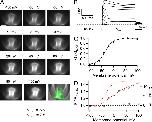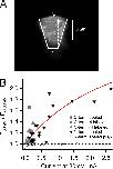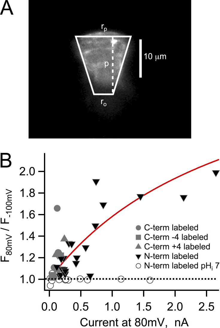 Figure 4. Fluorescence dequenching and proton depletion. (A) Fluorescence image of a typical patch expressing Hv1-Venus and approximation of its geometry by a truncated cone with the indicated dimensions used in the model in Eq. 4. (B) The value of the observed dequenching at 80 mV is plotted as a function of the current for that particular patch also at 80 mV. All of the experiments in this figure were obtained with an intracellular solution of pH 5.5, with the exception of those patches represented by the open circles. The continuous red curve is the dequenching as a function of current magnitude predicted by Eq. 4. The parameters that went into Eq. 4 were rp = 10 µm, ro = 5 µm, lp = 15 µm, Ka = 7.08 × 10−7, αo = 0.1812, fpKa = 5.6, DBH = 5 × 10−10 m2/s, and Btotal = 10 mM. The dotted line indicates lack of dequenching and describes the recordings from N-labeled channels at pHi 7. |