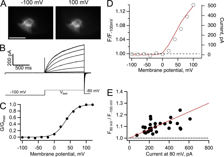 Figure 6. Recovery of fluorescence dequenching in VenusH148G-Hv1 at pHi 7. (A) Fluorescence images of an inside-out patch from an oocyte expressing the construct VenusH148G-Hv1 held at the indicated membrane potential. Bar, 10 µm. (B) Proton currents from the patch in A elicited by depolarizing voltage-clamp pulses. (C) Conductance versus voltage curve derived from the currents in B. The continuous line is a fit to Eq. 2 with parameters qa = 1.47 eo and V0.5 = 35.4 mV. (D) Fluorescence dequenching measured from the whole area of the patch in A. The red curve is the I-V curve for the same patch. (E) The fluorescence from 28 patches similar to A was measured at 80 mV, normalized to the fluorescence at −100 mV, and plotted as a function of the current magnitude at 80 mV, as in Fig. 4. A ratio greater than one at all voltages indicates dequenching of the fluorescence of VenusH148G. The bath solution contained 10 mM HEPES buffer. The continuous red line is the predicted dequenching by Eq. 4 with parameters rp = 10 µm, ro = 5 µm, lp = 15 µm, Ka = 2.81 × 10−8, αo = 0.26, fpKa = 7.6, DBH = 5 × 10−10 m2/s, and Btotal = 10 mM. |