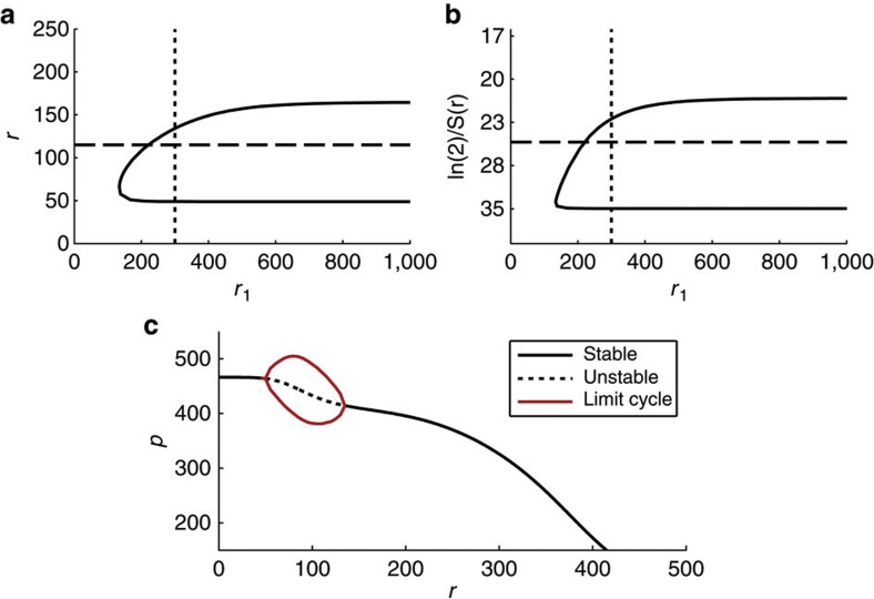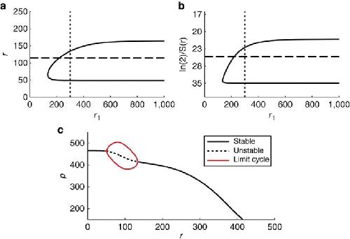 Figure 3. Presence of oscillations in the two-variable model when r acts via both mRNA degradation and translational repression.(a) Shows the location of Hopf bifurcations as r1 and r are varied. Here, oscillations exist to the right of the curve. The horizontal line indicates the value of r for which ln(2)/S(r)=25. The vertical dashed line indicates a value of r1=300. (b) as (a) but with y axis plotted in terms of mRNA half-life (ln(2)/S(r)). (c) A window of oscillations emerges for changes in r. The addition of translational repression allows a lower steady state for high r. Other parameters are p0=390, τ=29 min, bl=ln(2)/20 min−1, bu=ln(2)/35 min−1, n0=m0=m1=5, r0=100, μp=22 min. |