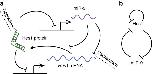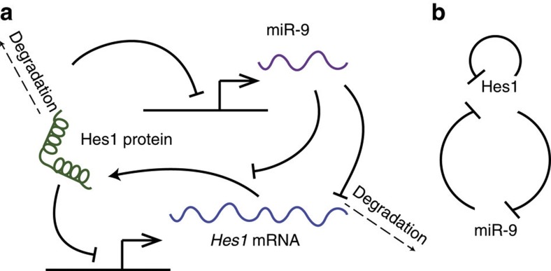 Figure 1. Experimentally determined network interactions between Hes1 and miR-9.(a) Detailed visualization of the Hes1/miR-9 network. Solid arrows indicate production, whereas flat line ends represent repressive interactions. (b) Simplified network motif. |