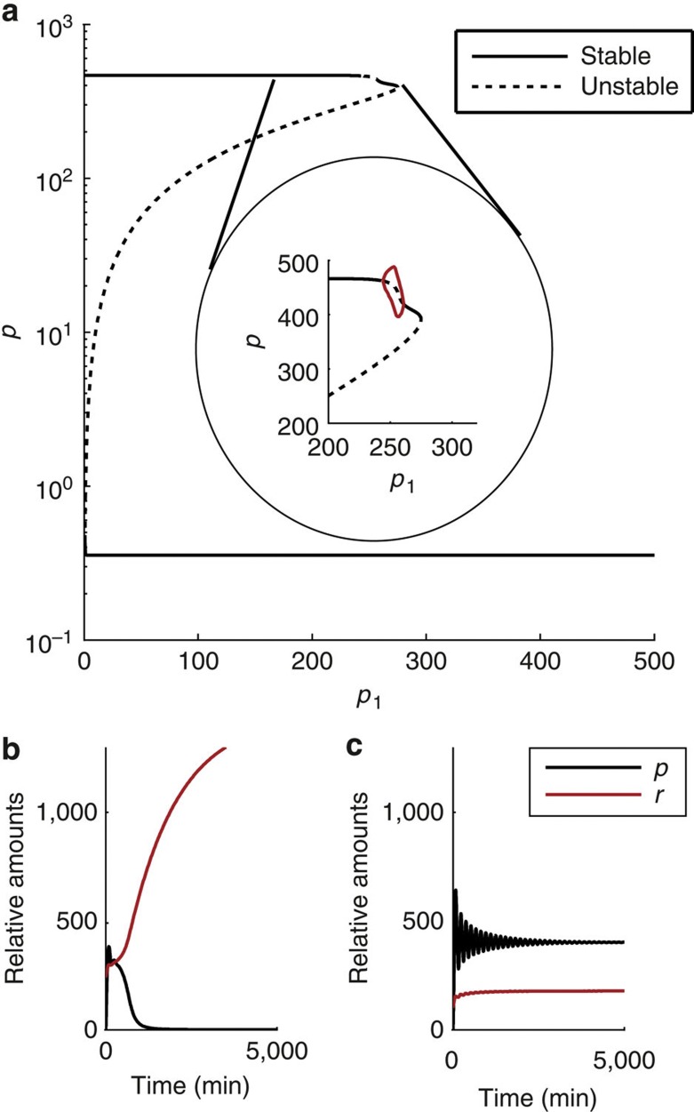 Figure 4. Oscillations and different steady-state levels of Hes1 in the full system for changes in the strength of repression of miR-9 by Hes1 (p1).(a) Shows a bifurcation diagram for changes in p1, with protein levels (p) given as output on the y axis. The circled area shows a magnified region of parameter space that contains oscillations (limit cycle maxima and minima given by red lines). (b,c) Show example of time series for a case of bistability (p1=272). The initial conditions (giving a constant history vector) are (b) m(0)=0, p(0)=0, r(0)=240 and (c) m(0)=0, p(0)=0, r(0)=100. Other parameters are p0=390, τ=29 min, bl=ln(2)/20 min−1, bu=ln(2)/35 min−1, n0=n1=m0=m1=5, r0=100, r1=300, μp=22 min, μr=1,000 min. |