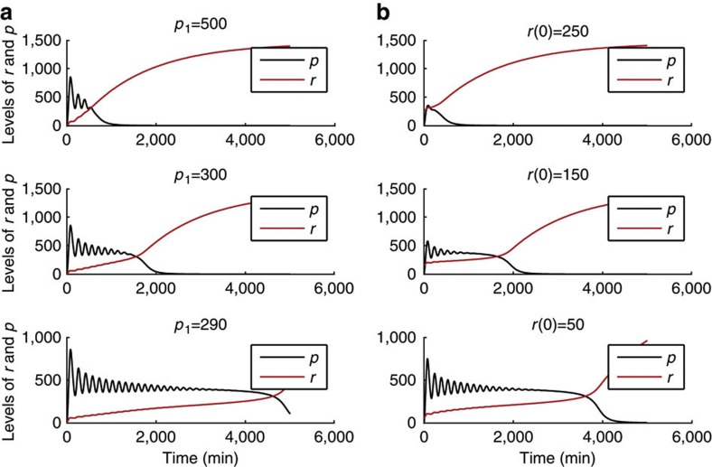 Figure 6. Different durations of oscillations can be found for changing p1 or the initial levels of r.(a) Shows simulations with fixed r(0)=0 but changing p1. (b) Shows simulations with fixed p1=290 but changing r(0). Here, m(0)=0 and p(0)=0. Other parameters are p0=390, τ=29 min, bl=ln(2)/20 min−1, bu=ln(2)/35 min−1, n0=n1=m0=m1=5, r0=100, r1=300, μp=22 min, μr=1,000 min. |
