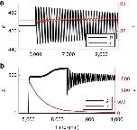 Figure 5. The high Hes1 steady state can be readily excited into transient oscillations.(a) The model is initiated in the high Hes1 state in a bistable regime (parameters as default and p1=220, initial conditions m=14.6766, p=465.8128, r=33.1285). At 5,000 min, the Hes1 mRNA levels are instantaneously set to a value 10% higher than at this steady state (that is, m=16.1433). The system is excited into transient oscillations. (b) The model is initiated in the low Hes1 steady state (initial conditions m=28.9, p=0.4, r=1442.6). To excite the system, at t=5,000 min, a perturbation of 15 units of protein (an initial 30-fold increase) is added every minute for 4,000 min. Other parameters are p0=390, τ=29 min, bl=ln(2)/20 min−1, bu=ln(2)/35 min−1, n0=n1=m0=m1=5, r0=100, r1=300, μp=22 min, μr=1,000 min. |