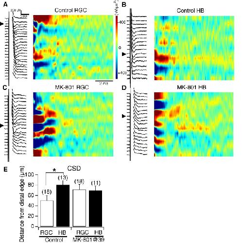 Figure 6. NMDA receptor blockade, starting at stage 39, disrupts the normal degree of spatial segregation between RGC and HB synaptic inputs: sample image plots.(A) Control RGC-evoked FPs with corresponding image plot. Main RGC-evoked sink is localized to the most distal end of the neuropil, with an additional minor sink in the proximal region. (B) Control HB-evoked FPs with corresponding image plot. Main HB sink is localized to the proximal region of the tectal neuropil. (C) MK-801 RGC-evoked FPs with corresponding image plot. Main RGC-evoked sink now appears in the proximal region of the neuropil instead of the distal region. (D) MK-801 HB-evoked FPs with corresponding image plot. Main HB-evoked sink now appears in both the distal region and proximal region of the tectal neuropil. Arrowheads refer to the site of the largest peak FP. (E) Bar graph summarizing the location of major RGC- and HB- evoked CSD sinks along the distal-proximal axis. For control tecta, the distance between the major RGC- and HB-evoked CSD sinks is significant, but not for tecta exposed to MK801 at stage 39.DOI: http://dx.doi.org/10.7554/eLife.20502.008 |