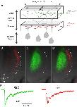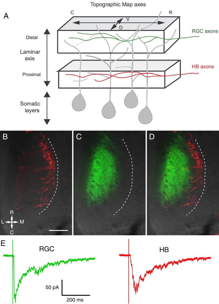 Figure 1. Visual and non-visual afferent inputs innervate different layers of the optic tectum neuropil and form synapses onto specific regions of tectal neuron dendrites.(A) Schematic of the optic tectum neuropil showing RGC inputs innervating the more distal or region of the neuropil and mechanosensory (HB) inputs innervating the more proximal region. The dendrites of the tectal neurons span the entire laminar axis such that an individual dendrite receives synaptic input from both sensory inputs. Both sets of afferent inputs form topographic maps across the rostro-caudal (R-C) and dorsal-ventral (D-V) axes. (B) A brightfield image of a single stage 49 optic tectum overlaid with fluorescent images to show DiI-labeled ipsilateral and contralateral hindbrain input (red), (C) DiD-labeled contralateral RGC input (green), and (D) merged image of B and C. The laminar axis lies along the lateral (L) to medial (M) axis. Notice that the RGC and HB inputs are segregated across this axis. The dashed line indicates the border between the somatic layer and the neuropil. (E) Whole cell recordings from a single tectal neuron in response to activation of (left) RGC inputs and (right) mechanosensory (HB) inputs. Note that both inputs evoke a monosynaptic response followed by polysynaptic activity, indicating that single neurons receive direct monosynaptic input from both sensory modalities and that both inputs activate local polysynaptic activity within the tectum. Scale bar is 50 μm. R: rostral, C: caudal, L: lateral, M: medial.DOI: http://dx.doi.org/10.7554/eLife.20502.002 |
