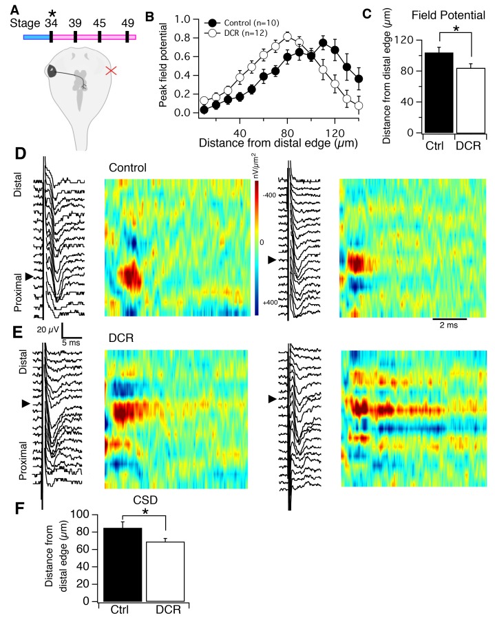Figure 3. Monocular enucleation at stage 34 shifts HB inputs towards the distal neuropil.(A), top) Timeline of when enucleation and then recording was carried out, and schematic showing monocular enucleation resulting in one tectal lobe (left) devoid of contralateral RGC axons (DCR) and the other tectal lobe (right) receiving normal contralateral RGC input. (B) Average normalized peak FPs of HB-evoked sinks from control tectal lobe (black) and the DCR tectal lobe (red) from the same brains, n = number of tecta. (C) Average distance from the distal edge at which the largest HB-evoked FP occurred in the control (black) and DCR (white). (D) HB-evoked FPs from two control (i.e. tectum with normal RGC inputs) with corresponding image plots. Note that the main HB-evoked sink is localized to the proximal region of the laminar axis in both examples. (E) HB-evoked FPs from two DCR tecta with corresponding image plots. Note that in both image plots the main HB-evoked sink has shifted to a more distal region along the laminar axis. Also notice that the pattern appears more dispersed along the axis in the example on the right. (F) Average distance from distal edge at which the largest HB-evoked CSD sink occurred in the control (black) and DCR (red). For all figures: * = p<0.05, ** = p<0.01, and *** = p<0.001.DOI: http://dx.doi.org/10.7554/eLife.20502.005 |
