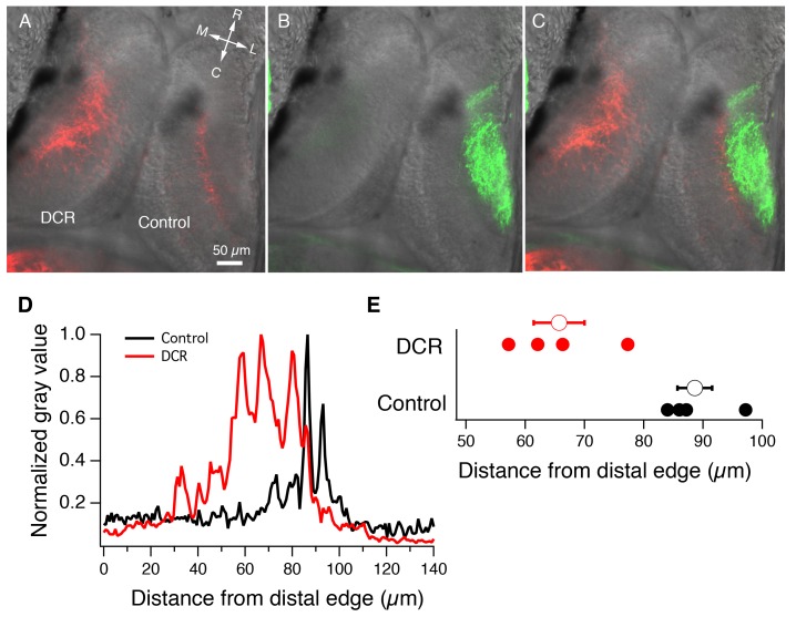 Figure 4. Monocular enucleation at stage 34 results in extended innervation of tectal neuropil by HB axons.(A) Bilateral DiI (red) labeling of HB inputs shows extensive HB axon innervation of the region of neuropil normally occupied by RGC axons in the DCR tectum. (B) DiD (green) labeling of the RGC inputs coming from the intact eye shows RGC axon innervation of control tectum. (C) Merged image of panels A and B. All fluorescent images are superimposed on transmitted light images to show relationship of multisensory axons relative to the tectum. R: rostral, C: caudal, L: lateral, M: medial. (D) Spatial fluorescence intensity plots for the HB axon innervation of control and DCR tectum shown in panel A. Fluorescence intensity is expressed as 8-bit gray value and has been normalized to optimize comparison of the relative profiles of control and DCR tecta. Notice that the profile for the HB axons of the DCR tectum is shifted distally compared to control. (E) A plot showing the distance from the distal edge at which HB fluorescence peaks, for individual control and DCR tecta. Each solid dot represents an individual tecta, and the larger, empty circle shows the corresponding average distance from distal edge at which maximum HB axon fluorescence for control and DCR is observed.DOI: http://dx.doi.org/10.7554/eLife.20502.006 |