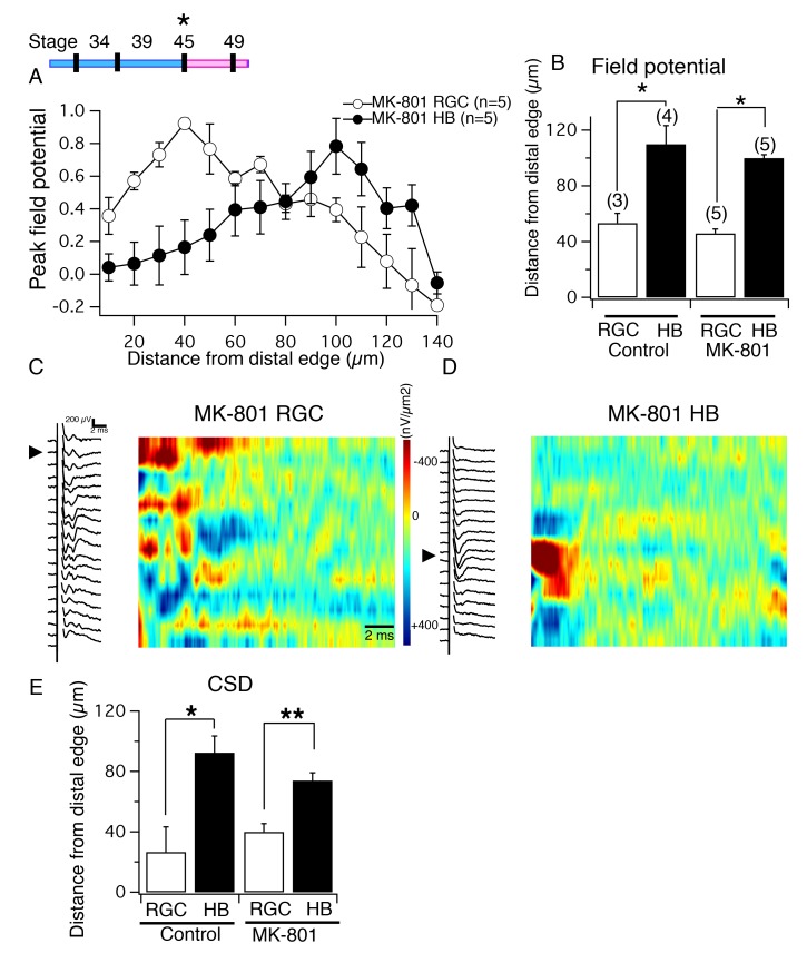 Figure 7. NMDA receptor blockade, starting at stage 45, does not disrupt the normal degree of spatial segregation between RGC and HB synaptic inputs.(Top, left) Timeline of experiment. (A) Average normalized peak FPs of RGC-evoked (white) and HB-evoked (black) inputs along the laminar axis of MK-801-reared tadpoles. The spatial FP profiles show distinct and separated peaks formed by RGC and HB inputs. (B) Average distance from the distal edge at which the largest RGC-evoked and HB-evoked FP amplitudes occurred in control and MK-801-reared tecta. (C) RGC-evoked FPs with corresponding image plot showing the largest RGC-evoked sink localized to the most distal region of the laminar axis. (D) HB-evoked FPs with corresponding image plot showing the largest HB-evoked sink localized to the proximal region of the laminar axis. (E) Bar graph summarizing the location of major RGC- and HB- evoked CSD sinks along the distal-proximal axis. For both control tecta and tecta exposed to MK-801 at stage 45, the distance separating the major RGC- and HB-evoked CSD sinks is significant.DOI: http://dx.doi.org/10.7554/eLife.20502.009 |