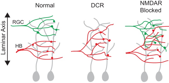 Figure 9. A summary figure showing the effect of monocular enucleation and NMDAR blockade at stage 39.RGC and HB afferent inputs arrive to the tectum at the same time (stage 39) and remain segregated along the laminar axis. Monocular enucleation before as RGC axons are just exiting the eye (stage 34) results in HB axons extending into tectal dendritic territory normally occupied by RGC axons. NMDAR blockade during synapse formation (stage 39), but not after synapses have been stabilized (stage 45), results in the desegregation of RGC and HB axons in the laminar axis.DOI: http://dx.doi.org/10.7554/eLife.20502.011 |