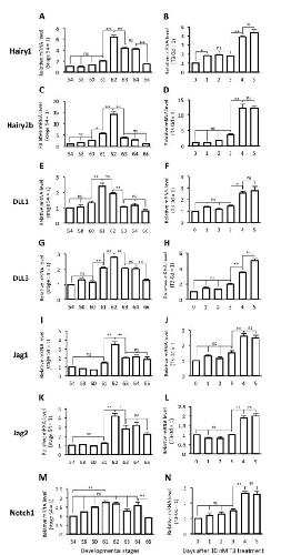 Expression profiles of genes involved in Notch signaling in X. laevis intestine during natural and T3-induced metamorphosis. Quantitative real-time RT-PCR was performed using total RNAs prepared from the intestine of animals at indicated developmental stages (A, C, E, G, I, K, M) or stage-54 tadpoles after 10 nM T3 treatment (B, D, F, H, J, L, N). Levels of Hairy1 (A, B), Hairy2b (C, D), DLL1 (E, F), DLL3 (G, H), Jag1 (I, J), Jag2 (K, L), and Notch1 (M, N) mRNAs are shown relative to those of ribosomal protein L8 (rpL8) mRNA, with the values at stage 54 or 0-day treatment set to 1. Error bars represent the SEM (nâ=â7 for A-D; nâ=â3 for E-H, J, M, N; nâ=â8 for I, L; nâ=â5 for K). The values were analyzed by ANOVA followed by Scheffe's post hoc test whose results are shown only for the adjacent stages or days except for Notch1 (M). Asterisks indicate that the mRNA levels are significantly different. *, pâ<â.05, **, pâ<â.01; ns: not significant.