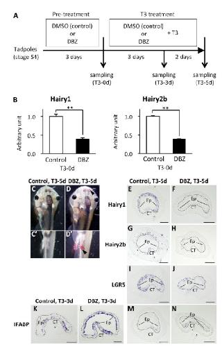 Inhibition of Notch signaling with dibenzazepine (DBZ) inhibits intestinal metamorphosis. (A): Schematic diagram of DBZ treatment study. Premetamorphic tadpoles at stage 54 were pretreated with DMSO (control vehicle) or 5 μM DBZ for 3 days. Then, the tadpoles were treated with 10 nM T3 in the presence of DMSO or DBZ. The intestine was isolated after 0, 3, or 5 days of T3 treatment and subjected to RNA extraction or cryosectioning. (B): quantitative real-time RT-PCR revealed that pretreatment with DBZ significantly repressed the expression of Hairy1 and Hairy2b in the intestine of premetamorphic tadpoles. Error bars represent the SEM (nâ=â3). The results were analyzed by Student's t-test (**, pâ<â.01). (C-D'): Gross morphology after 5 days of T3 treatment in the presence of DMSO (C, C') or DBZ (D, D'). Dorsal view of headâtrunk region (C, D) and ventral view of hindlimbs (C', D') are shown. Internal hemorrhage around the nose and along the digits of hindlimb is indicated by arrowheads (D, D'). (E-N) DBZ treatment delays the down-regulation of IFABP and the formation of the adult intestinal stem cells. Cross-sections of the intestine from the tadpoles treated with T3 for 3 (K, L) or 5 (E-J, M, N) days in the presence of DMSO (E, G, I, K, M) or DBZ (F, H, J, L, N) were hybridized with antisense Hairy1 (E, F), Hairy2b (G, H), LGR5 (I, J), or IFABP (K-N) probes. The dashed-lines indicate the boundary of the epithelium and the connective tissue. Scale barsâ=â100 μm. Abbreviations: CT, connective tissue, DBZ, dibenzazepine, Ep, epithelium. |