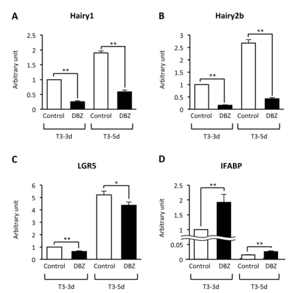 Inhibition of Notch signaling by dibenzazepine (DBZ) blocks the regulation of gene expression by T3. Total RNA was extracted from the intestine of tadpoles treated with T3 for 3 or 5 days in the presence of DMSO or DBZ as shown in Fig. 4A. quantitative real-time RT-PCR was carried out for Hairy1 (A), Hairy2b (B), LGR5 (C), and IFABP (D). Error bars represent the SEM (nâ=â3). The results were analyzed by Student's t-test (*, pâ<â.05; **, pâ<â.01). Abbreviation: DBZ, dibenzazepine. |