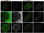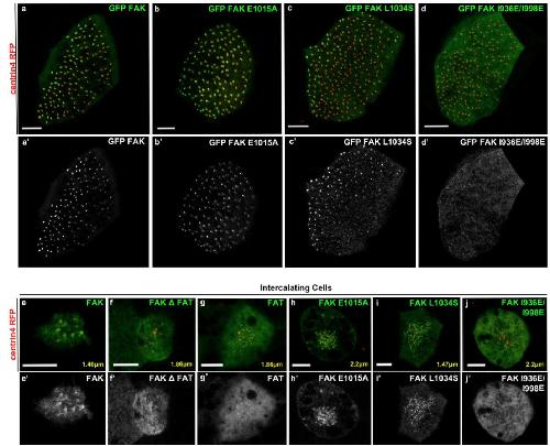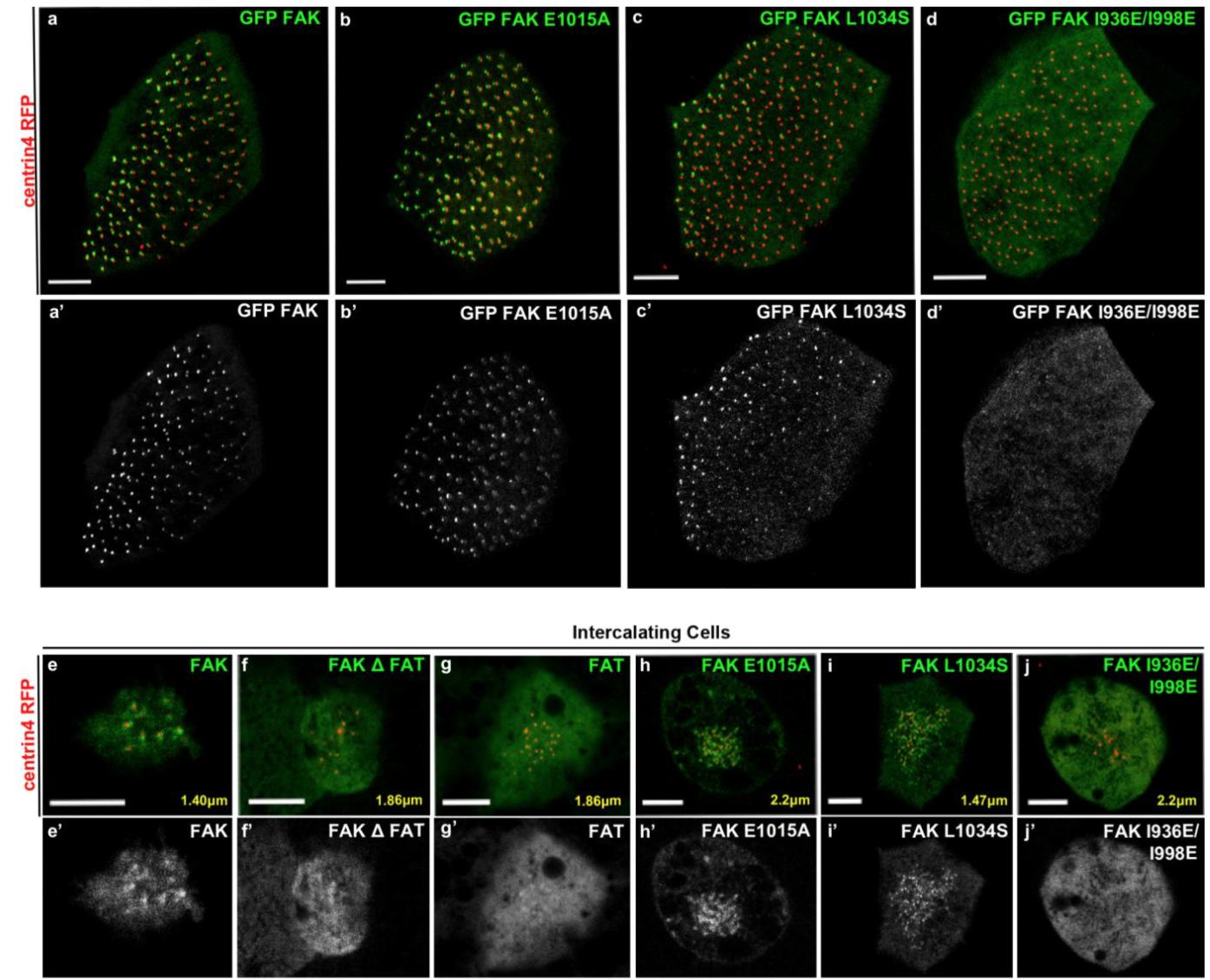 Fig. 2 Interaction with paxillin is not the sole determinant for FAKâs CA localization Merged and single channel (for GFP) maximum intensity projections (MIPs) of multiciliated cells, expressing centrin RFP (red in merged images) and GFP FAK or GFP-fused FAK mutants. (a-aâ) Full length FAK displays strong localization at CAs. (b-bâ) Talin binding-deficient FAK (E1015A) displays strong localization at CAs indicating that interaction with talin is not necessary for correct localization. Bright puncta in close association with basal bodies are present throughout the cell. (c-câ) FAK L1034S displays strong localization at CAs, while FAK I936E/I998E (d-dâ) fails to associate with the basal bodies. (e-j) Optical sections of intercalating multiciliated cells expressing centrin RFP and GFP-fused FAK mutants. (e-eâ) Wild type FAK localizes at CAs during basal body migration. CA-localized FAK appears as bright puncta associated with the basal bodies. Neither GFP FAK δ FAT (f-fâ) nor GFP FAT (g-gâ) associate with migrating basal bodies, suggesting that neither the FAT domain nor the FERM domain (present in GFP FAK δ FAT) are individually sufficient for localization at CAs. (h-hâ) GFP FAK E1015A localizes at CAs similarly to wt FAK. GFP FAK L1034S (i-iâ) associates with the migrating basal bodies while GFP FAK I936E/I998E (j-jâ) fails to do so. Scale bars: 5 μM. |