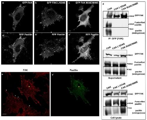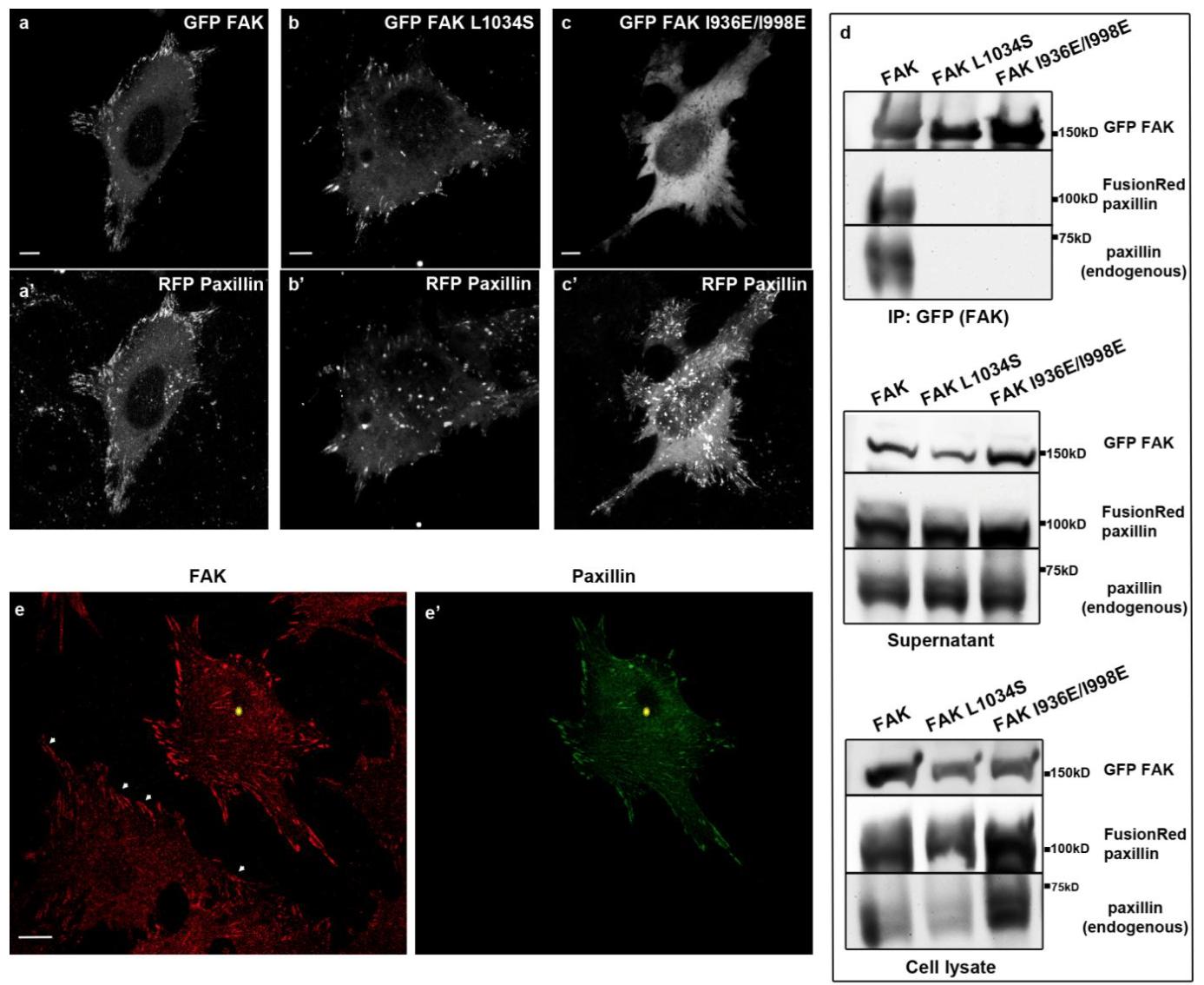 Fig. 7 The interaction of FAK with paxillin is not the sole determinant for FAKâs FA localization (a-c) HeLa cells expressing RFP paxillin (FA marker) and GFP FAK (a-aâ), GFP FAK L1034S (b-bâ) or GFP FAK I936E/I998E (c). FAK L1034S localizes at FAs while FAK I936E/I998E does not. (d) Representative blots showing immunoprecipitated GFP FAK, GFP FAK L1034S and GFP FAK I936E/I998E and blotted for GFP and paxillin. Wt FAK co-precipitates paxillin while none of the paxillin-binding mutants does. (e-eâ) Paxillin -/- and reconstituted (marked with yellow asterisk) cells immunostained against FAK. In both types of cells FAK is recruited at FAs showing that interaction with paxillin is not the only determinant for localization. Scale bars: 5 μμ. |