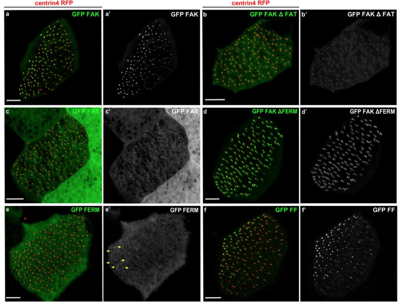 Fig. 1 FAK is recruited at CAs through its FERM and FAT domains Merged and single channel (for GFP) maximum intensity projections (MIPs) of multiciliated cells, expressing centrin RFP (red in merged images) and GFP FAK or GFP-fused FAK deletion mutants. (a-aâ) Full length FAK displays strong localization at CAs and each basal body is associated with a punctum of GFP FAK. CA complexes appear as bright puncta throughout the cell, displaying an anteroposterior intensity gradient. (b-bâ) FAK δ FAT does not associate with the basal bodies as efficiently as FAK and there are no bright CA-puncta, showing that the FAT domain is necessary for proper localization at CA complexes. (c-câ) The FAT domain is not sufficient to target FAK at CAs and only few faint CA-puncta are present in the cell. (d-dâ) GFP FAK δ FERM localizes strongly on the rootlets while the apical CA localization displayed by full length FAK (a-aâ) is absent. (e-eâ) The FERM domain is not sufficient to drive FAK at CAs and only few faint puncta, corresponding to CAs, are present. (f-fâ) GFP FF displays strong localization at CAs similarly to full length FAK showing that combination of the FERM and FAT domains is sufficient for proper localization of FAK. Scale bars: 5 μM. |