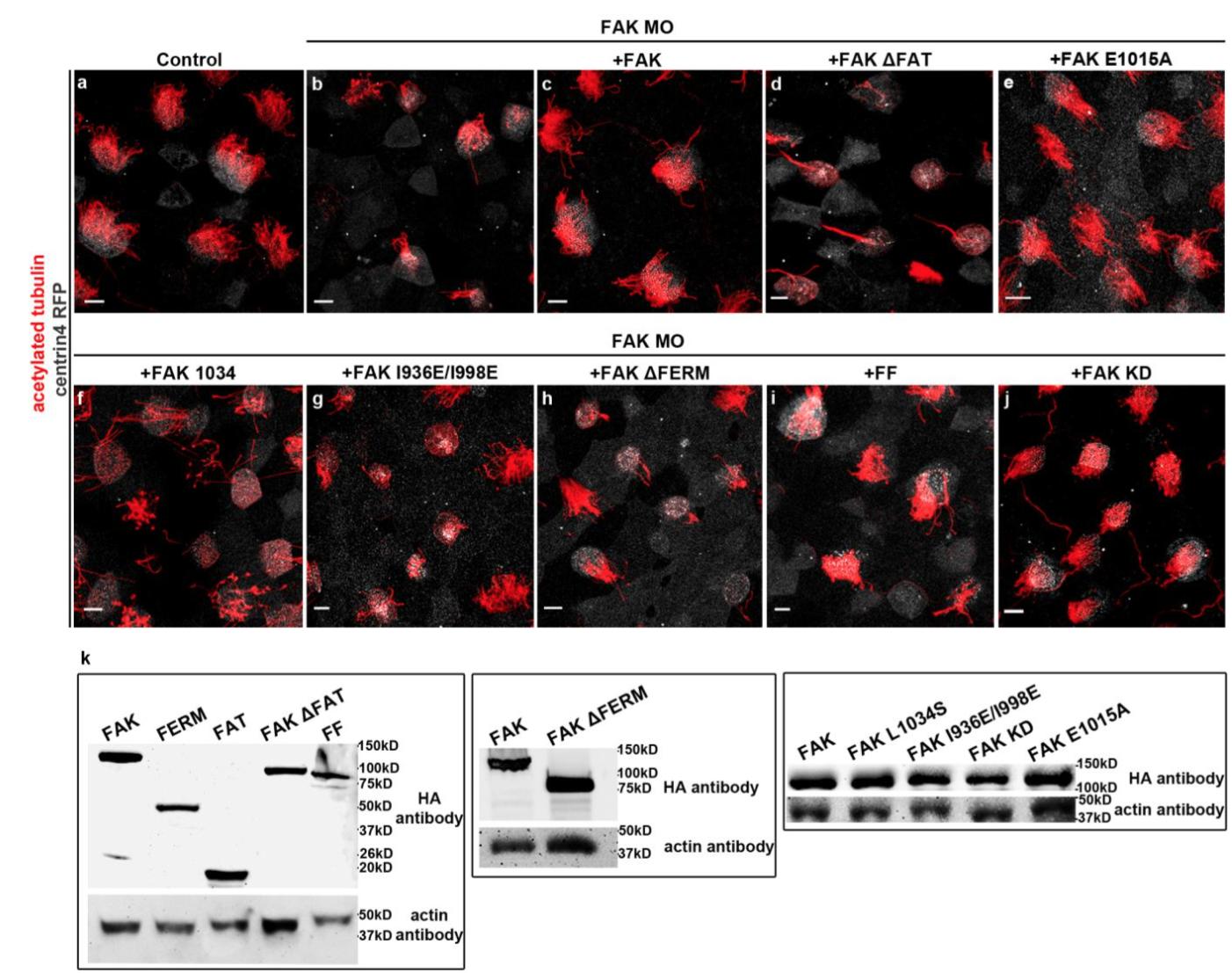 Fig. 3 FAKâs function during ciliogenesis depends on the FERM and FAT domains and interaction with paxillin, but is kinase independent Comparison of the ability of different mutants to rescue the FAK MO elicited ciliogenesis defects. Surface view (MIPs) of the multiciliated epidermis of Xenopus tadpoles, immunostained against acetylated tubulin which stains the cilia (red). Tadpoles have been injected with a FAK MO together with centrin RFP (grey) and different FAK constructs. Targeted cells are identified by expression of centrin RFP. (a) In control embryos cells appear normal with numerous cilia projecting from their apical surface. (b) In morphant embryos cells display severe ciliogenesis defects and have fewer or even no cilia. (c) Expression of wt FAK rescues the phenotype and cells project cilia normally. (d) Expression of FAK δ FAT fails to rescue the phenotype showing that the FAT domain is necessary for proper function of FAK during ciliogenesis. (e) Expression of FAK E1015A partially rescues the phenotype and the majority of cells project cilia normally, showing that interaction of FAK with talin may only play a minor role during ciliogenesis. (f-g) Expression of two paxillin binding-deficient mutants cannot rescue the ciliogenesis defects as the majority of cells have very few or no cilia, indicating that interaction with paxillin is critical for proper ciliogenesis. (h) Expression of FAK δ FERM does not rescue the defects showing that the FERM domain of FAK has an important role for its function in ciliogenesis. (i) Expression of FF leads to partial rescue of the phenotype. (j) Expression of kinase inactive (KD) FAK rescues similarly to wild type FAK showing that kinase activity is dispensable during ciliogenesis. (k) Expression levels of the FAK constructs used in rescue experiments analyzed in Western Blots. All constructs are stable and at the expected molecular weight. Scale bars: 10 μμ. |