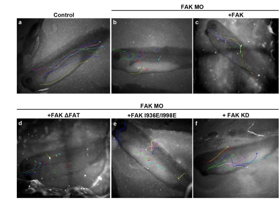 Fig. 5 Interaction with paxillin is necessary while FAKâs kinase activity is dispensable for the generation of ciliary flow (a-f) Representation of the flow of QDs as it was tracked over the skin of tadpoles. (a) Control embryos display robust and directional flow. FAK morphants (b) display impaired flow, while expression of wt FAK (c) partially rescues the phenotype leading to improved flow. Expression of FAK δ FAT (d) does not improve the flow, while in FAK I936E/998E expressing tadpoles (e) the flow is still impaired. (f) Expression or kinase inactive FAK leads to improved flow along the tadpoles showing that the kinase activity of FAK is dispensable for proper function in cilia. |