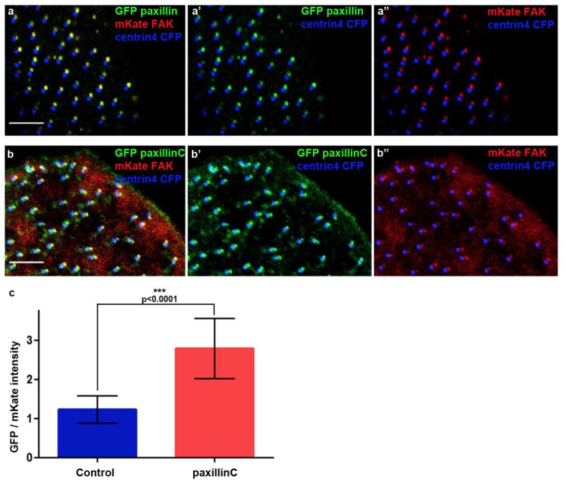 Fig. 8 The FAK-Paxillin interaction is partially responsible for FAKâs CA localization (a-aââ) Multiciliated cell expressing centrin CFP, mKate FAK and GFP paxillin. FAK co-localizes with paxillin at CAs. Each basal body displays strong localization of both paxillin and FAK. (b-bââ) Multiciliated cell expressing centrin CFP, mKate FAK and GFP paxillinC. FAK can still localize at CAs together with paxillinC but less efficiently. (c) Quantification of the ratio of GFP/mKate signal on separate CAs, from two tailed unpaired t-test. Error bars represent S.E.M. While in control cells (expressing GFP paxillin) the mean ratio is 1.2 ± 0.026 (Mean ± SEM) (n=226 CAs from 9 embryos) in cells expressing GFP paxillinC the mean ratio is increased, more than two fold, to 2.8 ± 0.052 (Mean ± SEM) (n=207 CAs from 11 embryos) (***, p<0.0001). Scale bars: 2 μμ. |