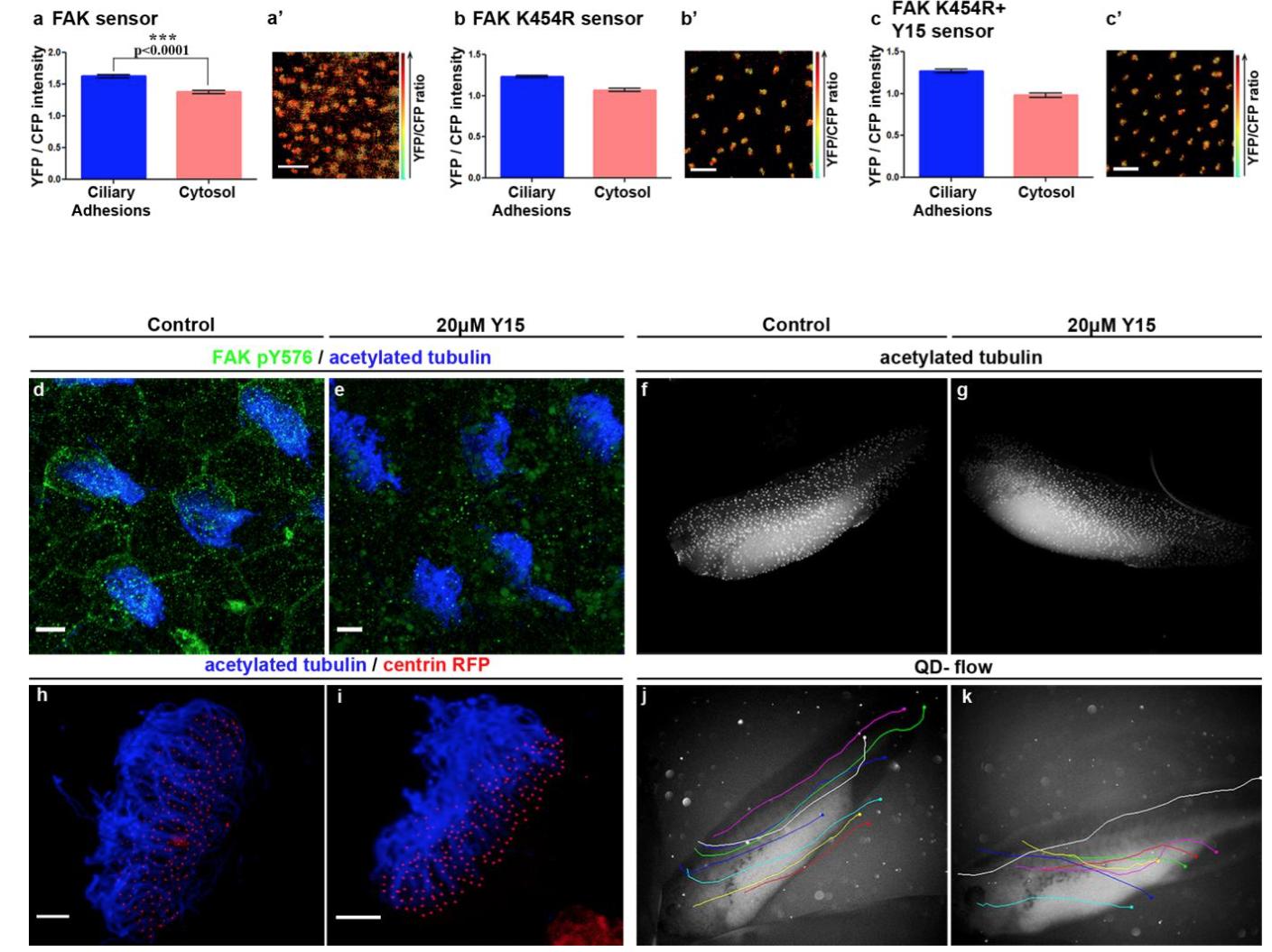 Fig. 9 The FERM-Kinase interaction is disrupted at CAs in a kinase activity independent manner (a-c) Quantification of the YFP to CFP intensity ratio of the wt (a) and the kinase inactive (K454R) FAK biosensor (b and c) in control (b) and Y15 treated embryos (c), at CAs and in the cytosol. Results were analyzed with two tailed unpaired t-test. Error bars represent S.E.M. (a) The YFP/CFP ratio at CAs is higher than in the cytosol (***, p<0,0001, n=37 CAs and n=33 cytosolic regions from 3 embryos) suggesting that FRET is specifically elevated at CAs. (b-c) The ratio remains higher in the absence of any enzymatic activity showing that the conformational change at CAs is kinase activity independent (***, p<0,0001, n=40 CAs and n=30 cytosolic regions from 5 embryos in b; and ***, p<0,0001, n=28 CAs and n=24 cytosolic regions from 3 embryos in c). (aâ, bâ and câ) Color coded images of the YFP/CFP intensity ratio of the FAK biosensors, showing higher ratio at CAs and suggesting that FAK is in the open conformation at these sites. (d-e) Epidermal region of embryos immunostained for p-Y576 FAK and acetylated tubulin. (d) FAK is phosphorylated at cell-cell contacts and dense cilia project from the apical surface of multiciliated cells in control embryos. (e) Treatment with the Y15 inhibitor blocks phosphorylation on tyrosine 576 and no signal is detected at cell-cell contacts while cilia project normally. Treatment of embryos with the inhibitor, during ciliogenesis stages, does not affect the density of multiciliated cells along the epidermis (g) or the docking and spacing of basal bodies (i) compared to control embryos (f and h). (j-k) Tracking of the QD flow over the skin of control or inhibitor treated tadpoles. Like controls (j), embryos treated with the Y15 inhibitor (k) produce robust posteriorward flow, showing that inhibition of FAKâs kinase activity does not affect either ciliogenesis or the function of cilia and their ability to generate flow. Scale bars: 2 μμ in aâ, bâ and câ; 10 μμ in d and e; 5 μμ in h and i. |